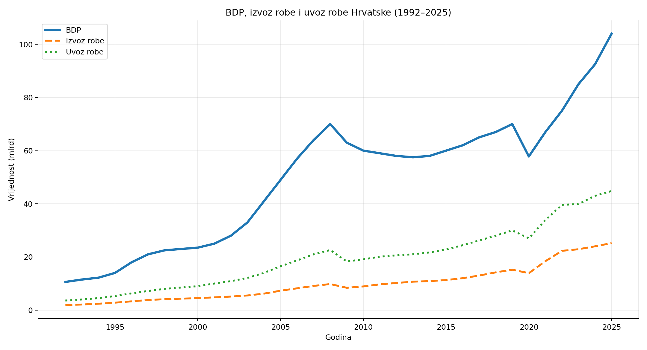 Hrvatsko gospodarstvo od 1992. do 2025. prošlo je kroz nekoliko faza, uključujući snažan pad tijekom rata, stabilan rast do 2008., dugotrajnu stagnaciju nakon globalne financijske krize te oporavak nakon 2015. godine. BDP dugoročno bilježi značajan rast, uz kratke padove tijekom krize 2009.–2014. i pandemije 2020. godine. Izvoz i uvoz također kontinuirano rastu, pri čemu je uvoz tijekom cijelog razdoblja veći od izvoza, što ukazuje na stalni trgovinski deficit. Nakon ulaska u Europsku uniju i posebno nakon 2020., vidljiv je ubrzan rast svih pokazatelja. Ukupno gledano, hrvatsko gospodarstvo pokazuje trend stabilizacije i rasta unatoč povremenim krizama.