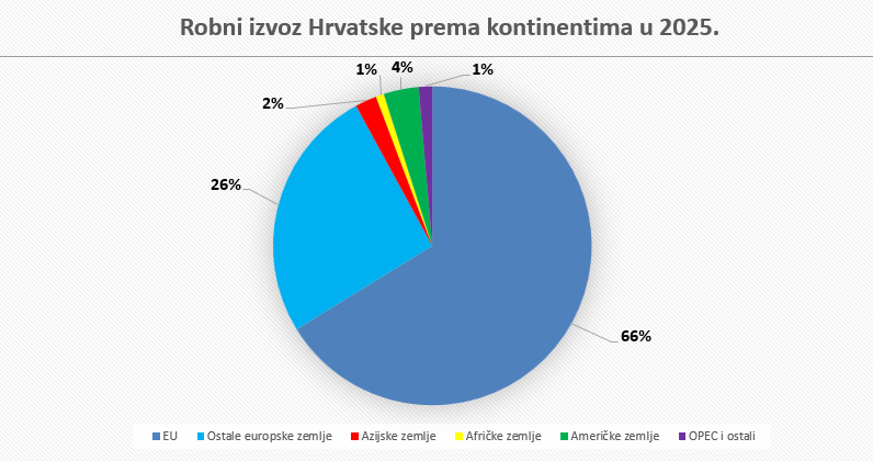 U 2025. godini robni izvoz Hrvatske izrazito je koncentriran na Europu, pri čemu zemlje Europske unije čine oko 66%, a ostale europske zemlje dodatnih 26% ukupnog izvoza. To znači da ukupno oko 92% robnog izvoza ide prema europskim tržištima, što pokazuje snažnu regionalnu usmjerenost gospodarstva. Izvoz prema ostalim kontinentima (Azija, Afrika, Amerika i ostali) čini tek manji udio, pojedinačno od oko 1% do 4%.